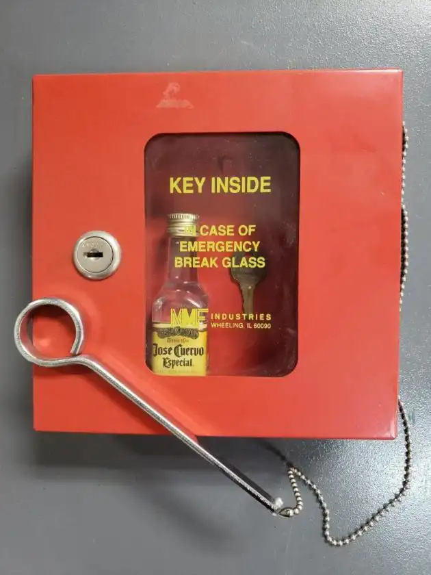 • This bright red box can be spotted easily in an emergency situation. The keys can be obtained by breaking the glass with the attached hammer.