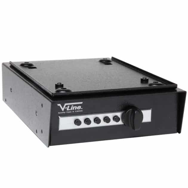 The Desk Mate is designed to be mounted discretely under a desk or shelf for quick access to a single firearm or other valuables. The Desk Mate features an easily programmable, five push button mechanical lock that does not require batteries. The Desk Mate comes standard with a felt lined tray which can aid in organizing and accessing smaller valuables. The bottom inside of the Deskmate is felt lined for protection of your valuables. The black powder coated finish on the case is accented on the dropdown drawer with a V-Line gold logo. The Desk Mate comes standard with a quick release mounting bracket (part no. 2597-MB BLK) which secures the case to the underside of most desks or shelves for security and easy portability. Anti-pry brackets in the interior of the Desk Mate provide additional security from prying.
