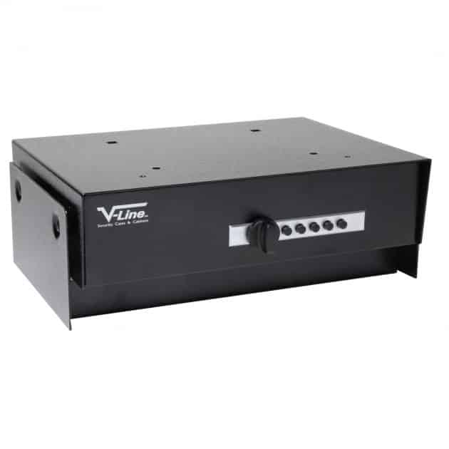 The Hide-Away is a larger version of the Deskmate but also includes a pull out shelf for easy access to firearms or valuables. The Hide-away is large enough to accommodate up to two pistols along with extra clips or other valuables such as cameras, keys, watches, etc. The Hide-Away incorporates the same easily programmable, five push button mechanical lock that does not require batteries. Nicely finished in a semi gloss black powder coating and accented on the dropdown drawer with a V-Line silver logo. The Hide-Away comes standard with a quick release mounting bracket (part no. 3912-MB BLK) which secures the case to the underside of most desks or shelves for security and easy portability. Ideally suited to be mounted under cabinets, shelves or desks for quick access.