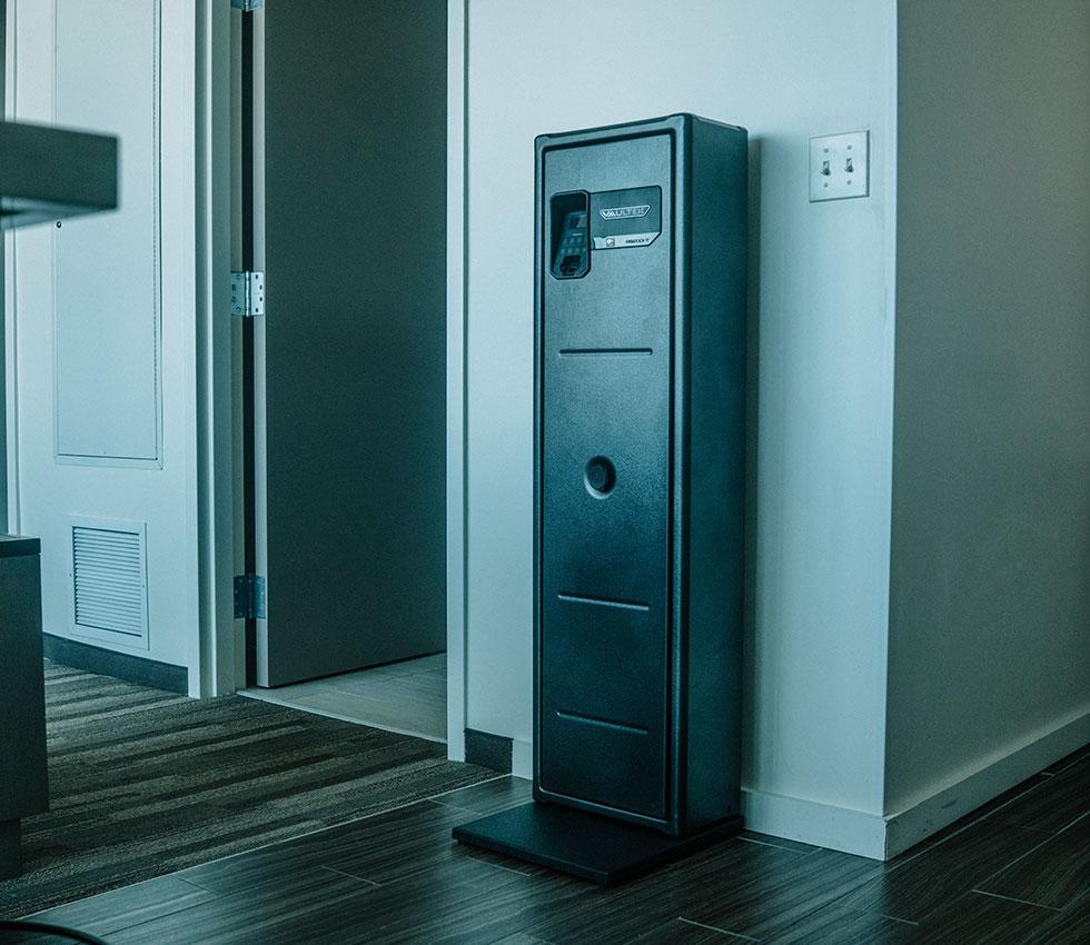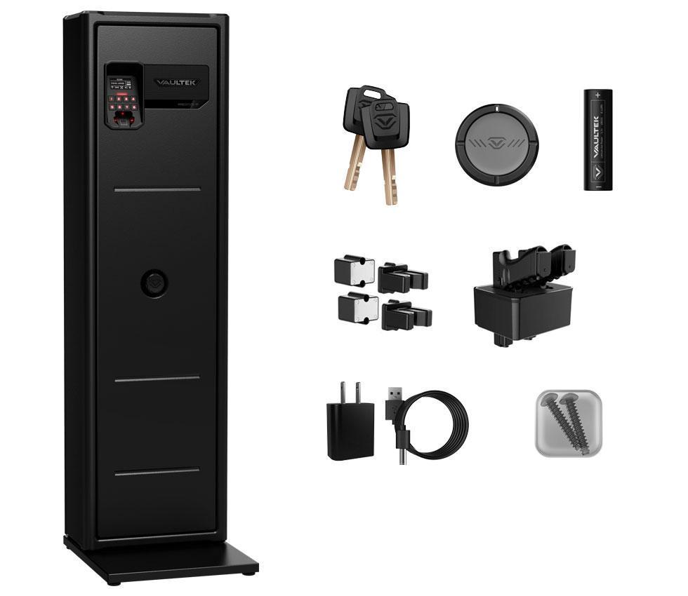 - Silm design making it extremely versatile in placement and storage. Can store up to (2) rifles. Tough and rugged 14-gauge carbon steel construction using Vaultek’s exclusive metal forming technique features a durable finish to prevent corrosion and ensure long-lasting protection.
