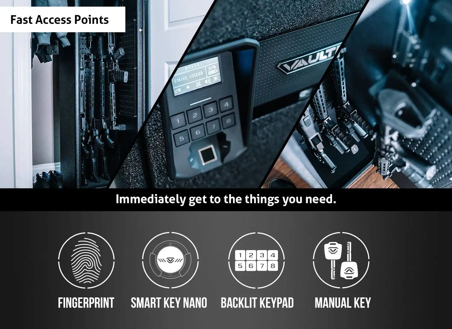 - QUICK ACCESS to your valuables and documents from the auto-open door. Get in quick when it matters most using the gaming-inspired action of the backlit keypad with over 19,000,000 unique combinations, biometric scanner capable of storing 20 unique fingerprints, fastest access point available that includes a Smart Key Nano, and backup keys are also included.