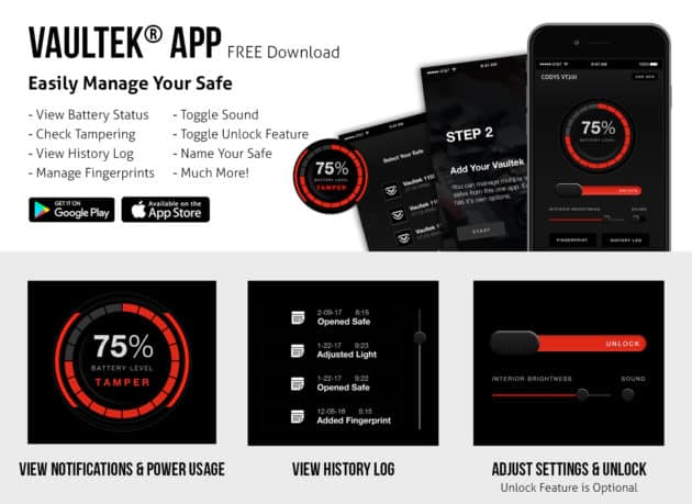 - Smart safe technology uses the Vaultek bluetooth app for a highly interactive experience from your smartphone. View battery status, adjust the brightness of the interior light, unlock the safe remotely with one simple swipe and more.