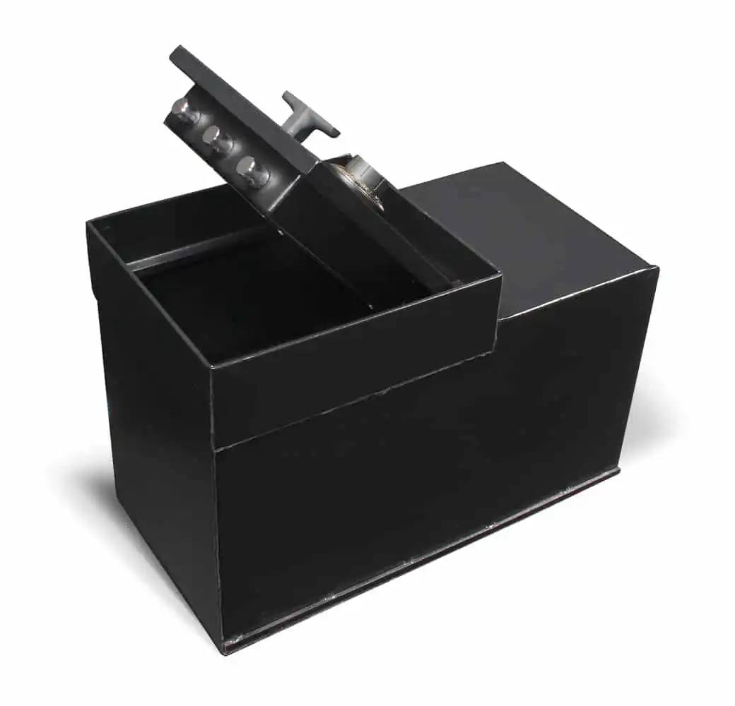 - A handle activated locking mechanism consisting of three 1″ diameter locking bolts. Each one is drive resistant, chromed steel with a long throw.